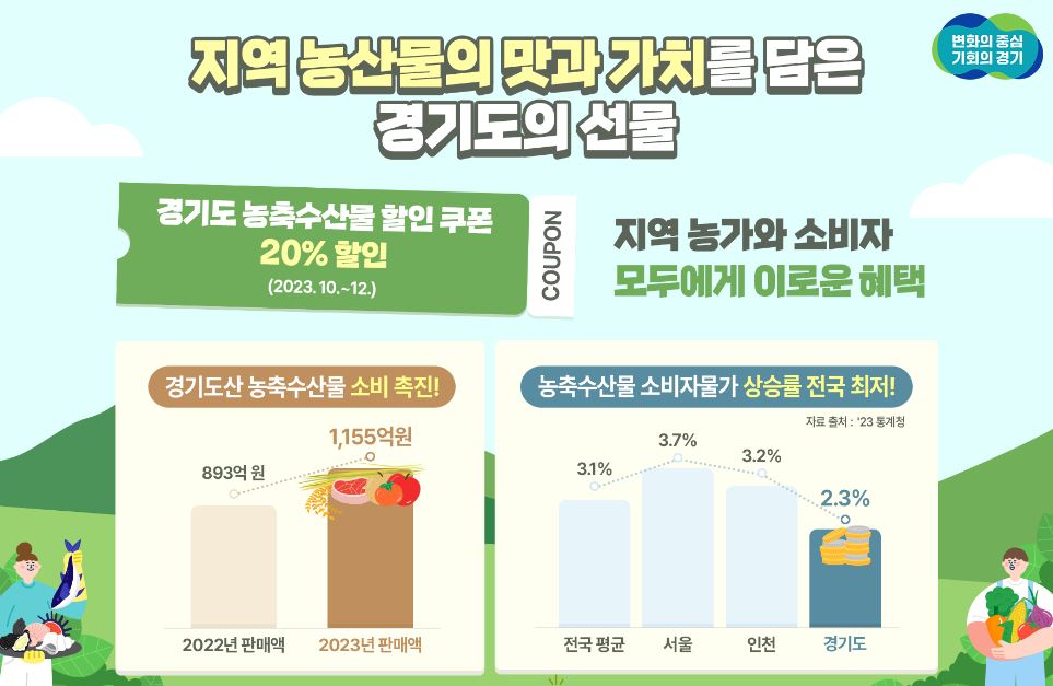 14일 경기도에 따르면 도가 지난해 10월부터 12월까지 3개월간 농축수산물 할인쿠폰 지원사업을 시행한 결과 오프라인과 온라인을 통해 약 1,155억 원의 경기도산 농축산물이 판매된 것으로 집계됐다.