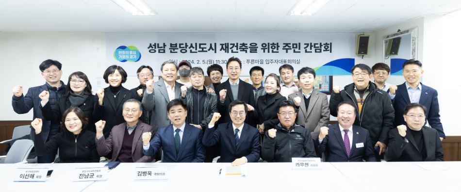 <사진설명> 5일 오전 성남시 분당구 푸른마을 입주자대표회의실에서 김동연 경기도지사, 김병욱 국회의원, 김세용 GH사장, 라우현 푸른마을 재건축준비위원회 위원장, 성남시 시의원을 비롯한 지역주민이 참석한 가운데 노후계획도시 특별법 시행령안 및 1기신도시 광역교통체계 수립 관련 주민의견 청취를 위한 성남분당 재건축 주민간담회가 열렸다. 이어 설을 앞두고 인근 금호행복시장을 둘러보는 시간을 가졌다.