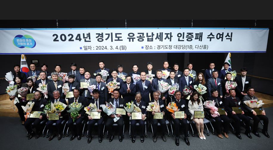 <사진설명> 4일 오후 경기도청 다산홀 1층에서 김동연 경기도지사 및 경기도 유공납세자 등 150여 명이 참석한 가운데 2024년 경기도 유공납세자 인증패 수여식이 열렸다.